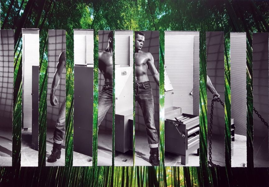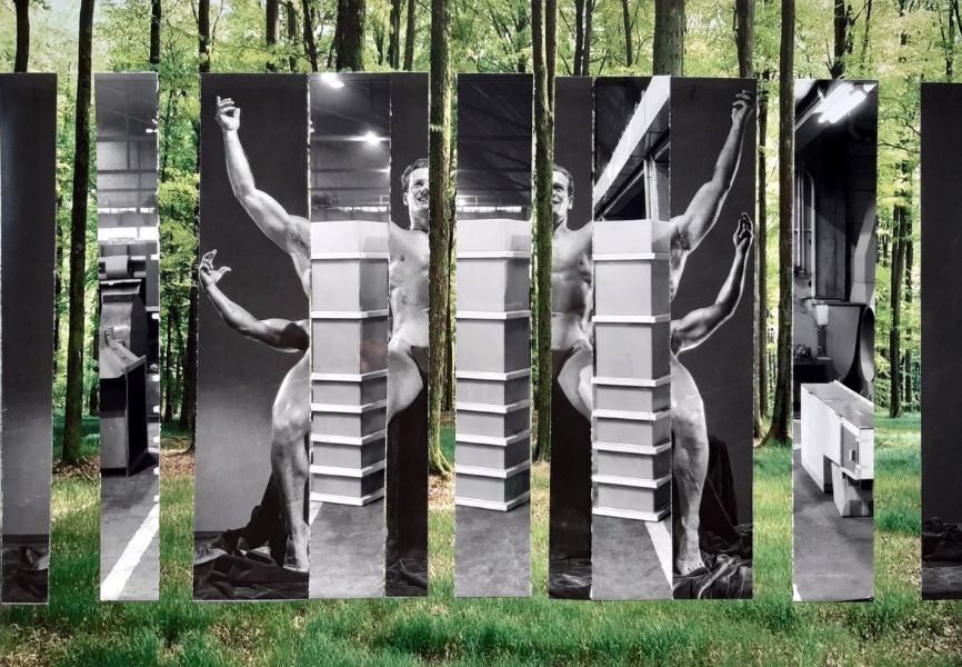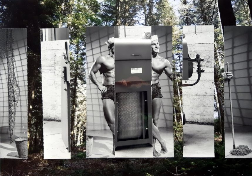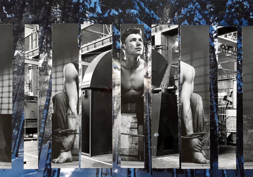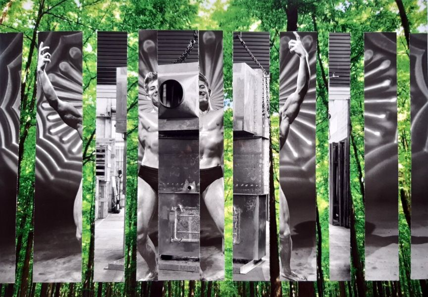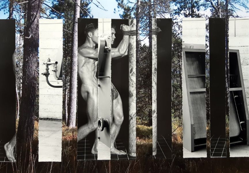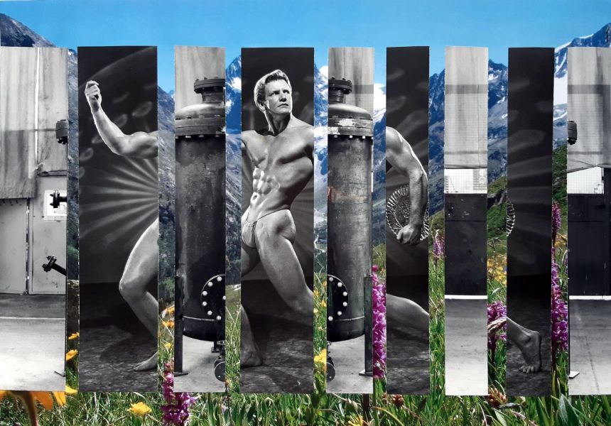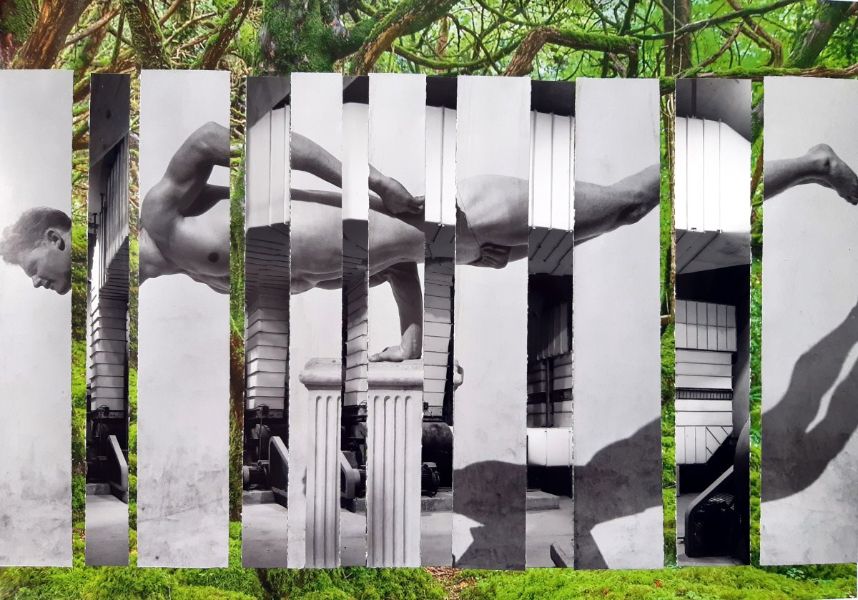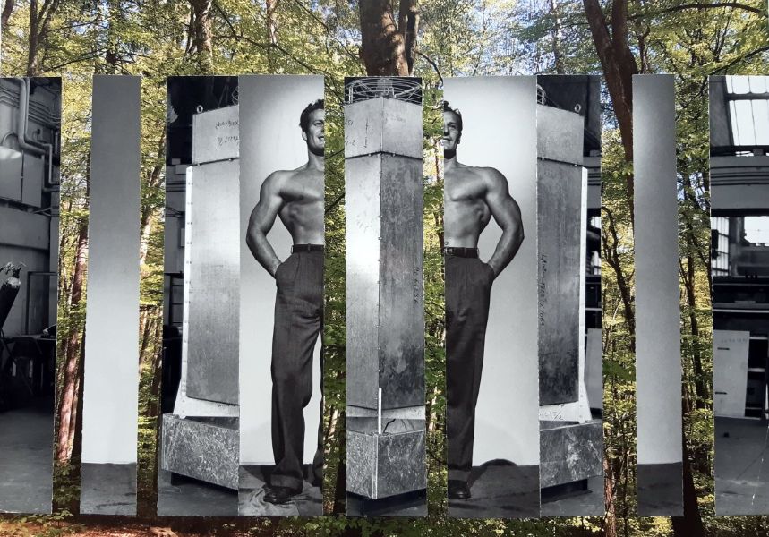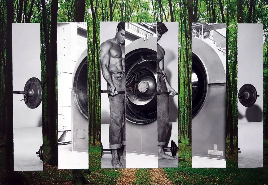 Des collages en forme d’expérimentations illustrant l’analogie entre le corps, l’arbre et la machine sous l’angle des mécanismes en branle et des rouages permettant le fonctionnement et la croissance tout autant végétale que musculaire.